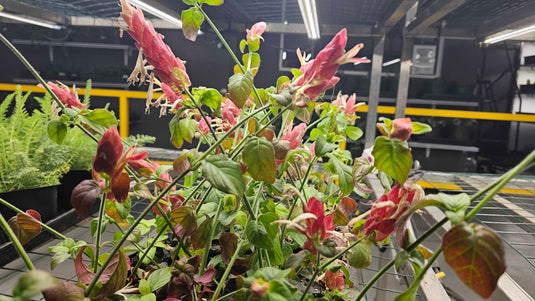 Each flower spike resembles a large shrimp that attract bees, butterflies, and hummingbirds with their vibrant tubular blooms